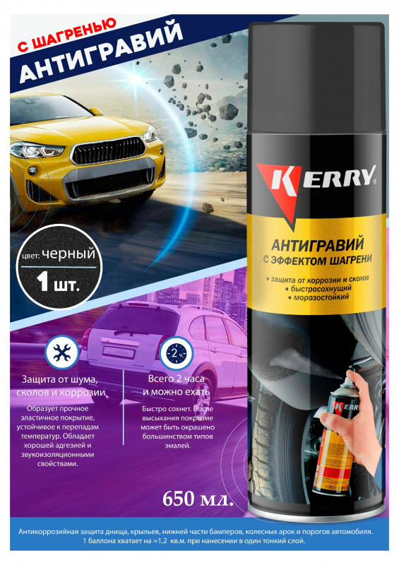 Профессиональное средство Антигравий KERRY® с эффектом шагрени KR-971 для восстановления текстурных покрытий на новых и ремонтируемых деталях автомобилей (колесные арки, пороги, крылья и т. п.) и создания долговременной защиты от летящих камней и песка, создающих интенсивную абразивную нагрузку. Способно предотвращать повреждения элементов нижней части кузовов легковых автомобилей и прочих транспортных средств. Обладает хорошей адгезией и звукоизоляционными свойствами, устойчиво к перепадам температур, сохраняет эластичность в холодное время года, не растрескивается и не отслаивается на морозе. Быстро сохнет, после высыхания может быть окрашено большинством эмалей.