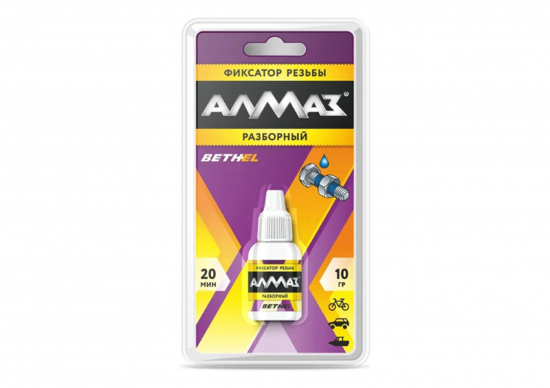 Герметик фиксатор резьбы АЛМАЗ РАЗБОРНЫЙ 10мл блистер- анаэробный герметик применяется для надежной фиксации металлической резьбы. Предотвращает самоотвинчивание и герметизирует соединения. Полимеризуется только при отсутствии воздуха и контакте с металлом. Характеристики: Время фиксации - 10-30 минут (в зависимости от вид