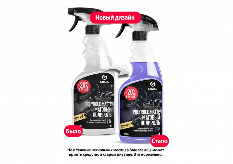 Профессиональный матовый полироль Grass «Polyrole Matte» для обработки приборных панелей, неокрашенных бамперов, покрышек, для очистки и полировки изделий из кожи, дерева винила, пластика и резины, не оставляет жирных пятен, препятствует оседанию пыли придает матовый блеск, обладает приятным ароматом.
