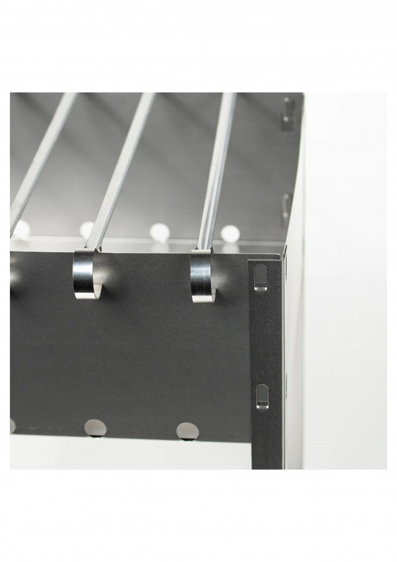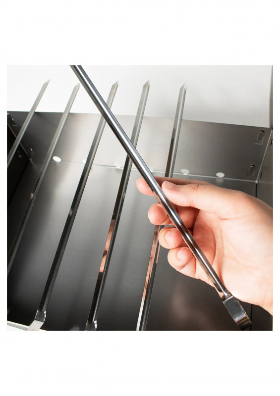 Изделие состоит из четырех боковых стенок прямоугольной формы, с крючками для сборки (отверстиями для сборки), прямоугольного днища и четырех угловых ножек (крючками для сборки) с отверстиями для сборки. В комплекте 6 угловых шампуров 370*10*0,5мм