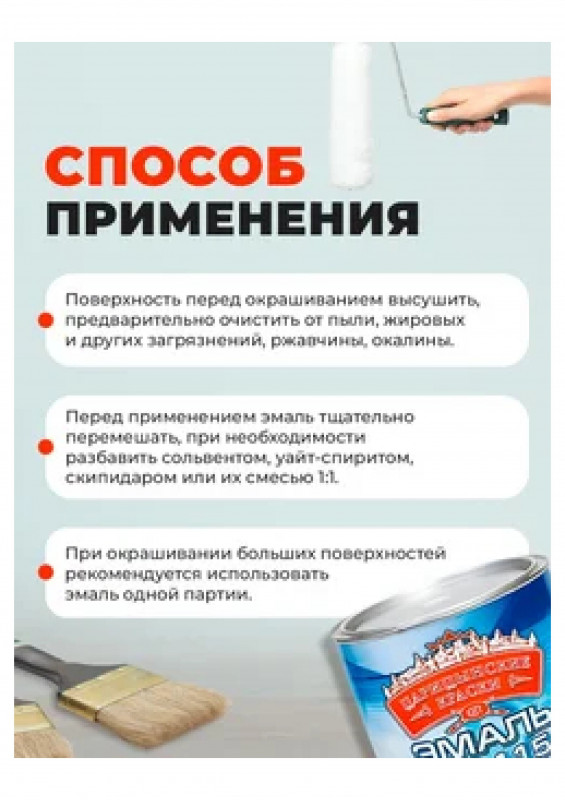 поверхность перед окрашиванием высушить, предварительно очистить от пыли, жировых и других загрязнений, ржавчины, окалины. Перед применением эмаль тщательно перемешать, при необходимости разбавить сольвентом, уайт-спиритом,скипидаром или их смесью 1:1. При окрашивании больших поверхностей рекомендуется использовать эмаль одной партии.
