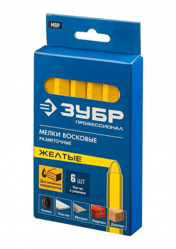 Разметочные восковые мелки ЗУБР МВР желтые, 6 шт 06330-5 незаменимы при нанесении пометок на гладкие и шероховатые материалы (металл, бетон, пластик, керамику, древесину, резину, картон и т.д.). Изделие не боится влаги и подходит для работы как на сухой, так и на влажной поверхности.